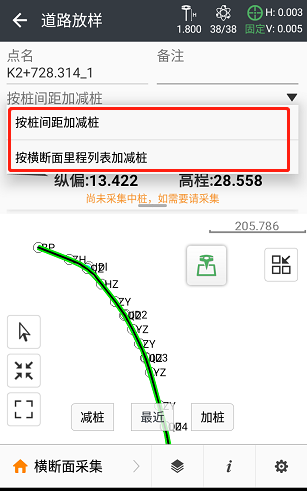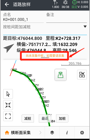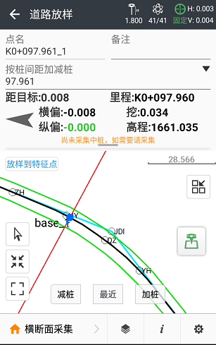 横断面采集过程中,离中桩0.5米,软件会切换到中桩放样模式,采集的离中桩最近的点会被认为是中桩点,不需要切换到中边桩放样去采集中桩。